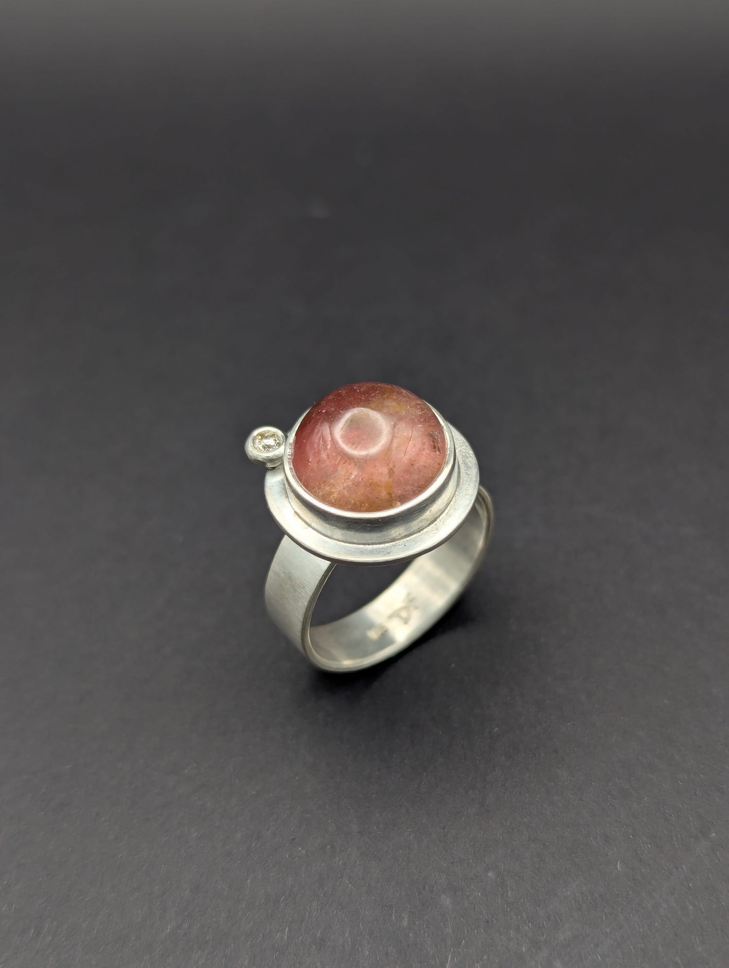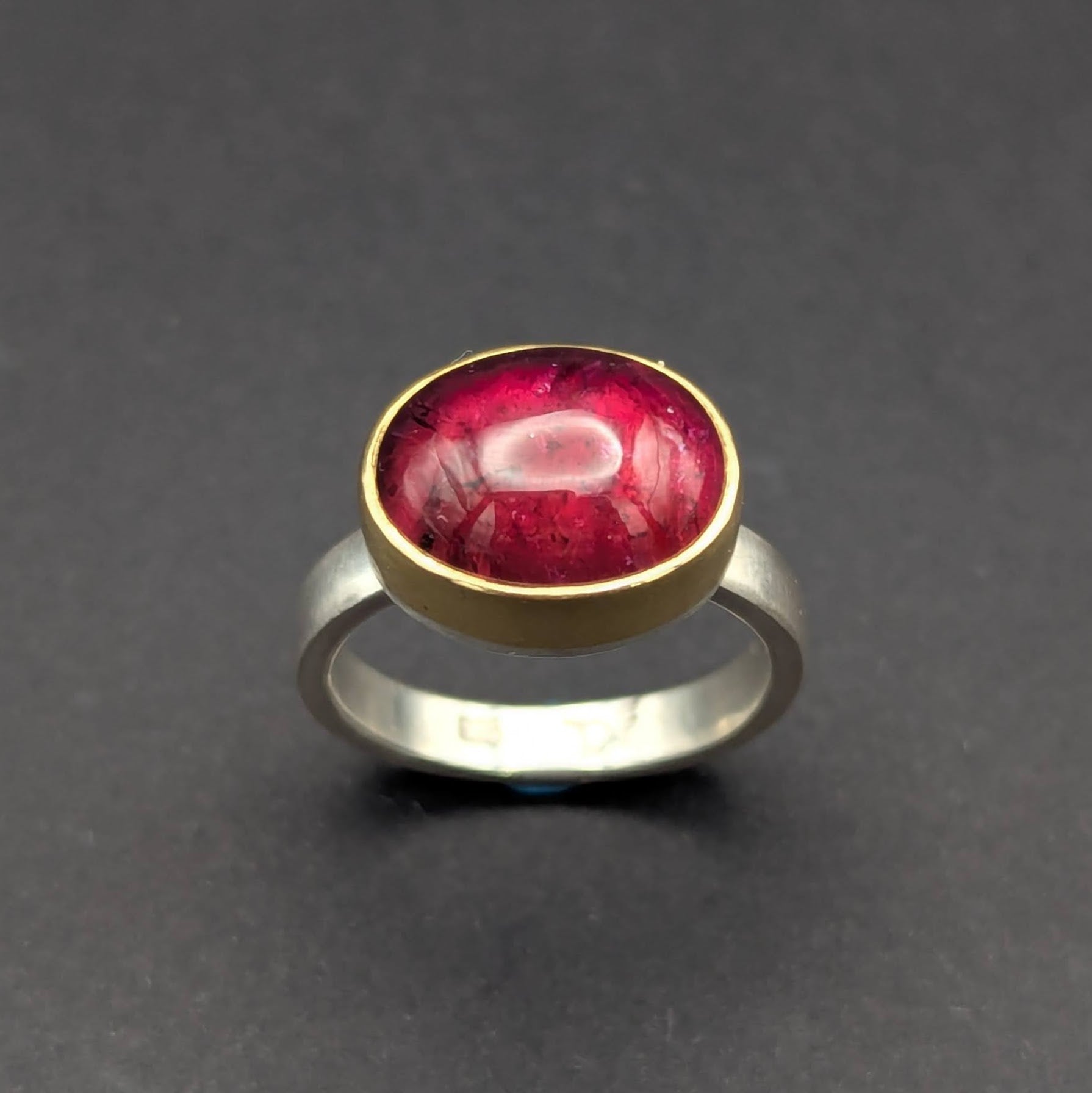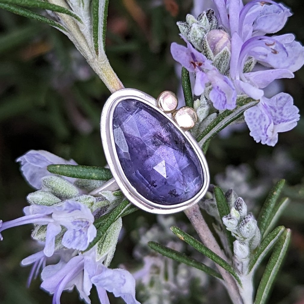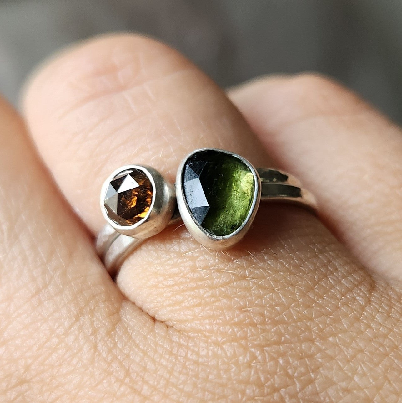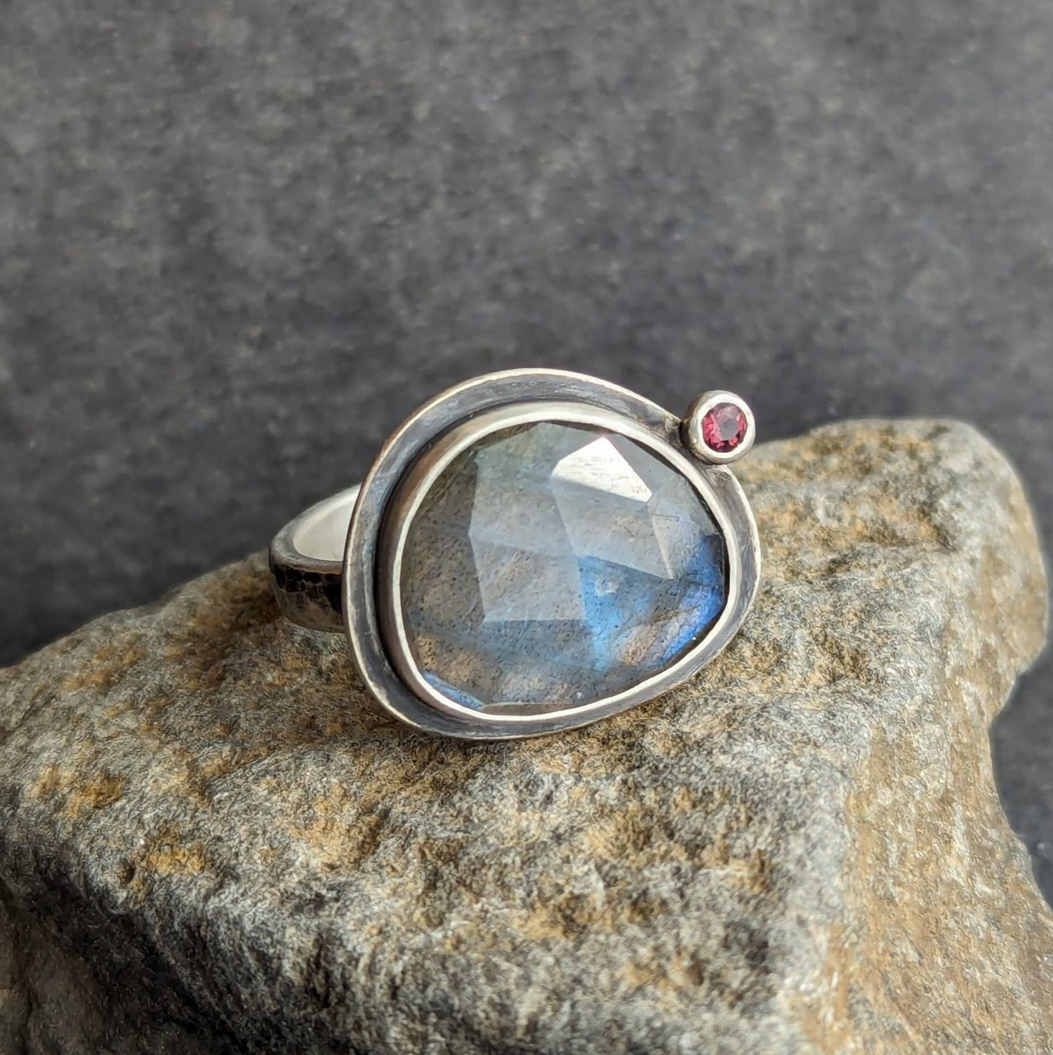Rose Cut Labradorite and Red Tourmaline. Oxidized sterling silver.
