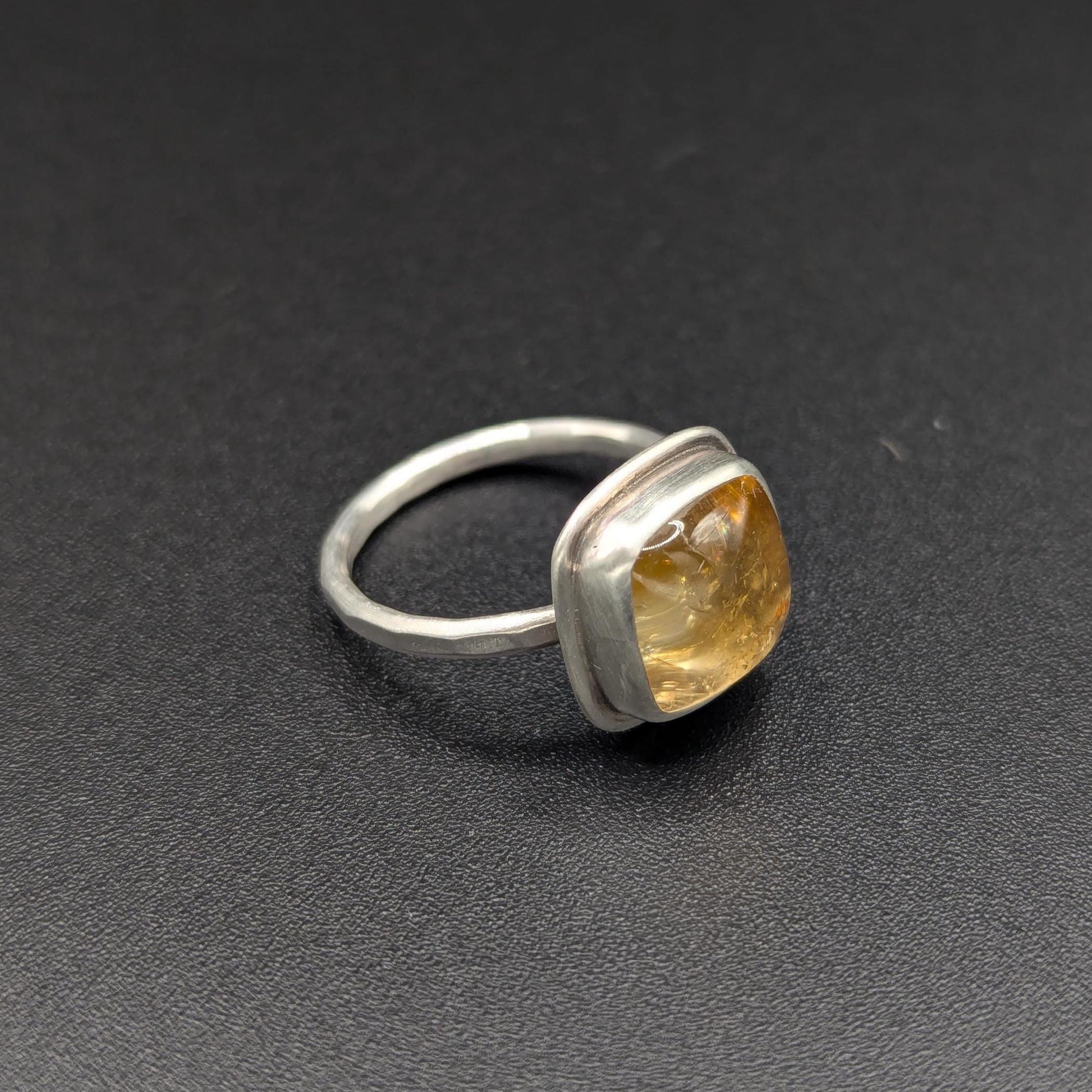 This amazing natural citrine cabochon is set in silver with a with a hammered band and brushed finish. The ring band measures 1.88mm wide. Citrine is the birthstone for November.