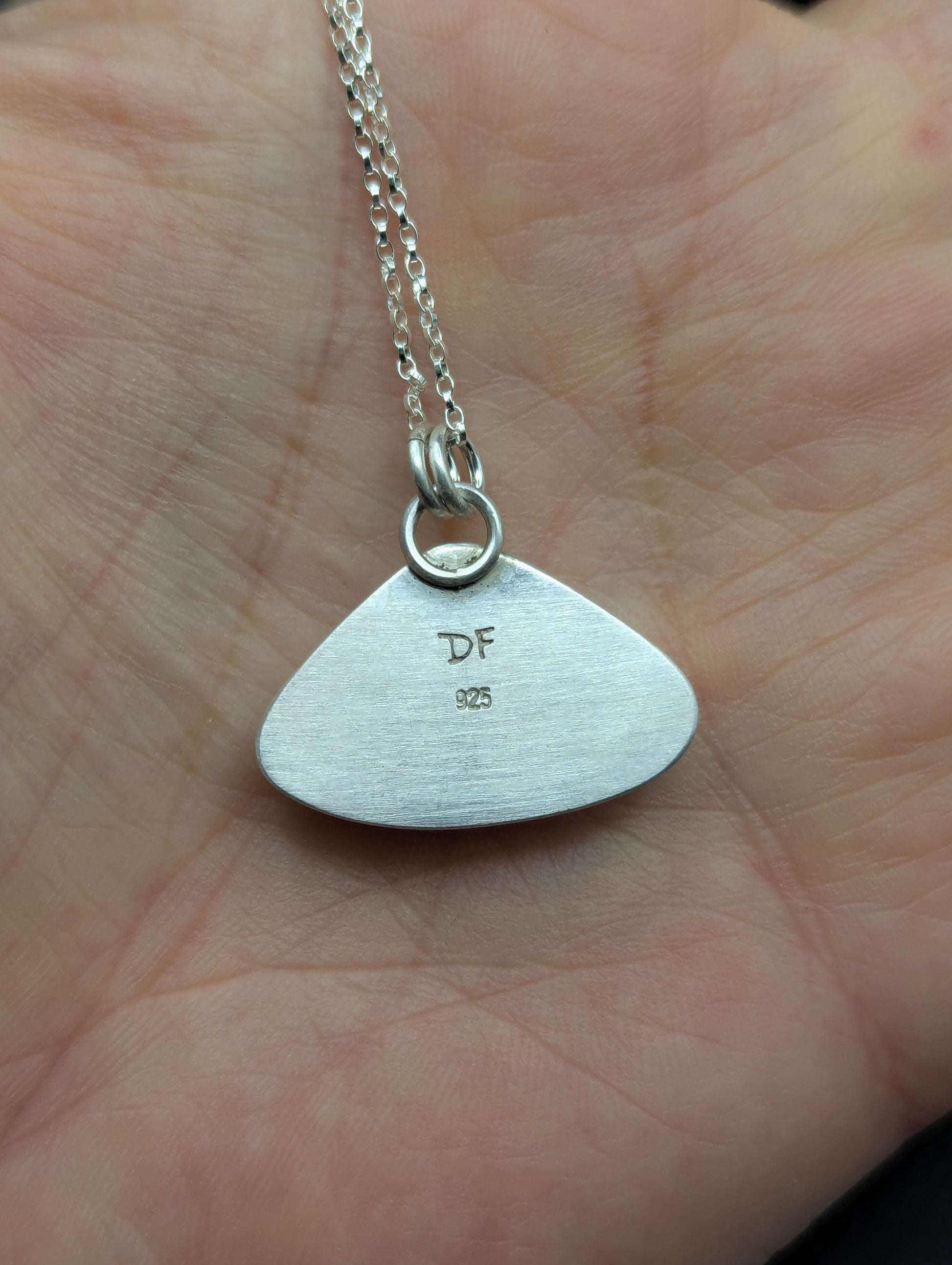 Jasper cut in house by David Forshee and set in brushed sterling silver. 18" chain.