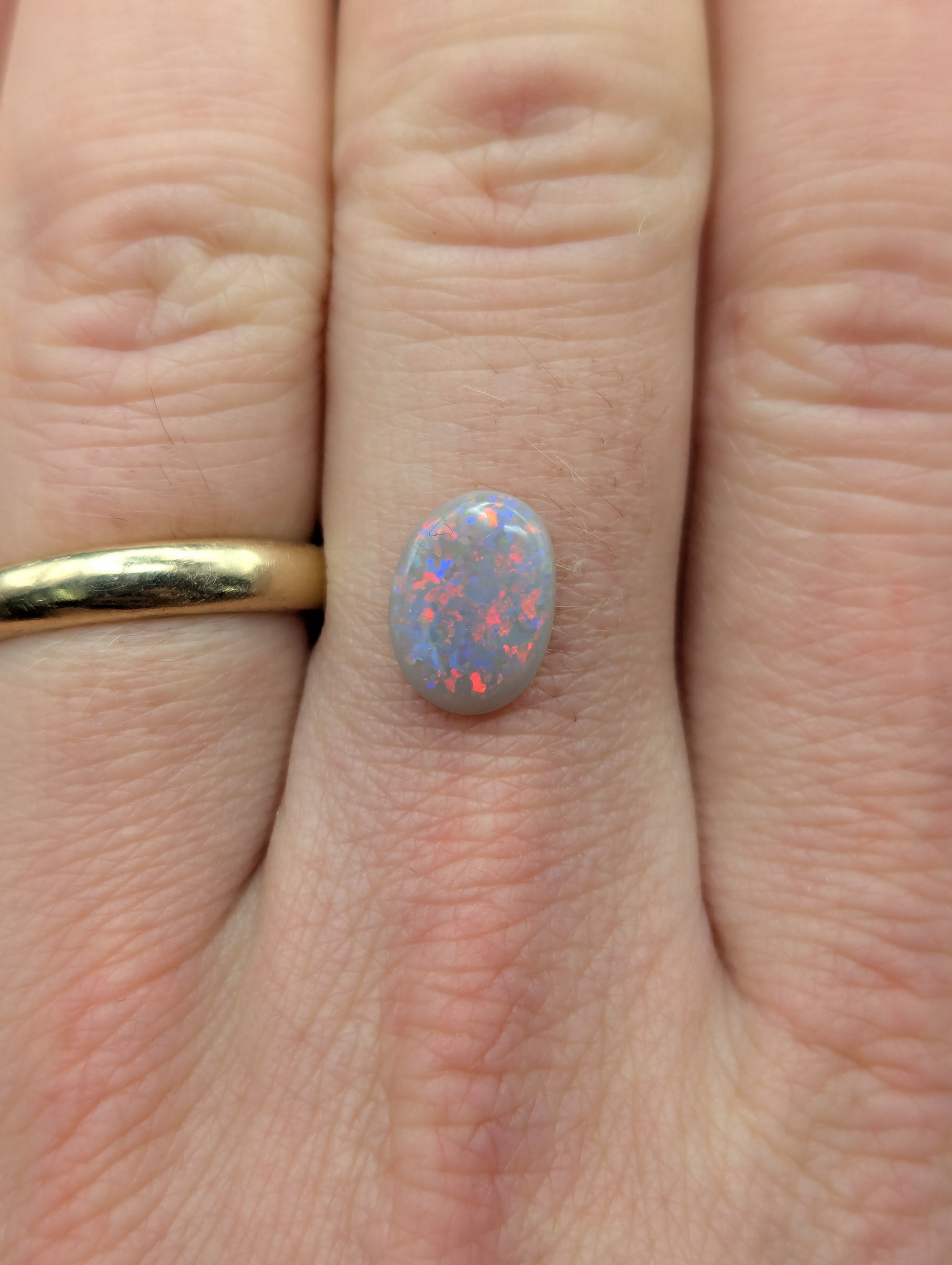 This is a solid opal from Lightning Ridge. Grey base with sparkles or red and blue.