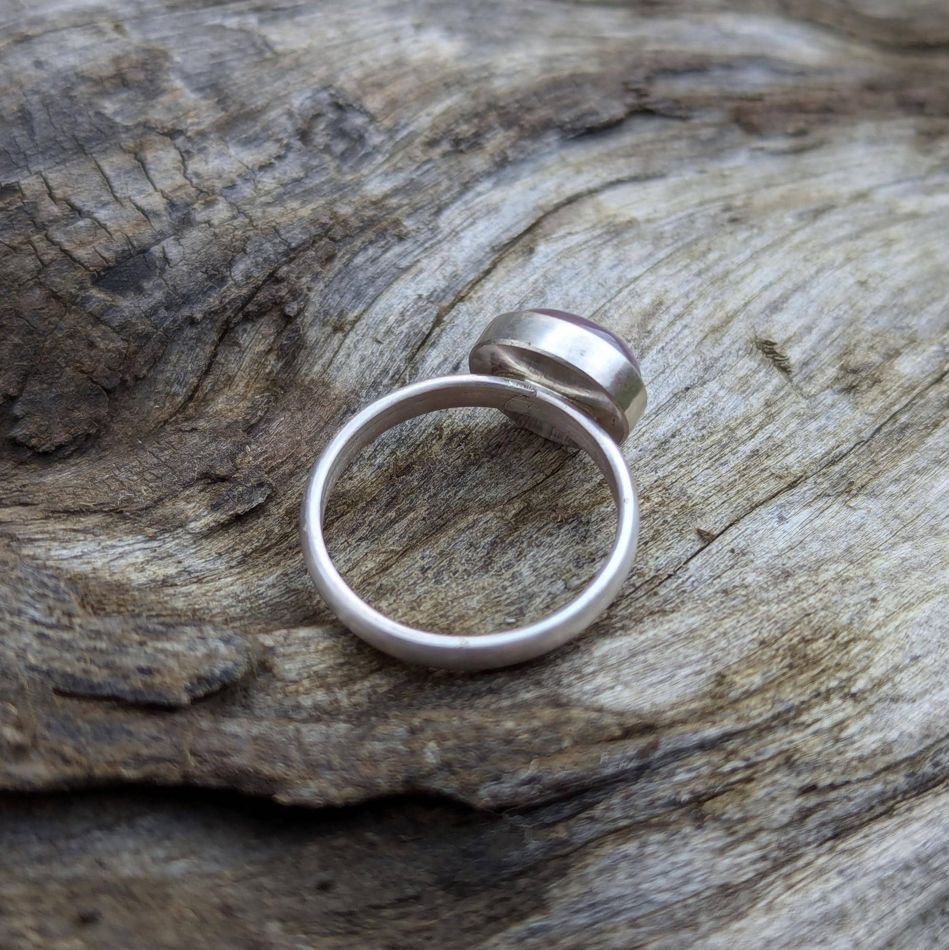 This beautiful purple chalcedony oval cabochon is set in a simple sterling silver bezel and given a brushed finish. The deep purple color provides a feeling of calmness and tranquility. The ring band is smooth and comfortable to wear. The ring itself is closed and attached to the back of the bezel so this would pair well with some stacking rings.