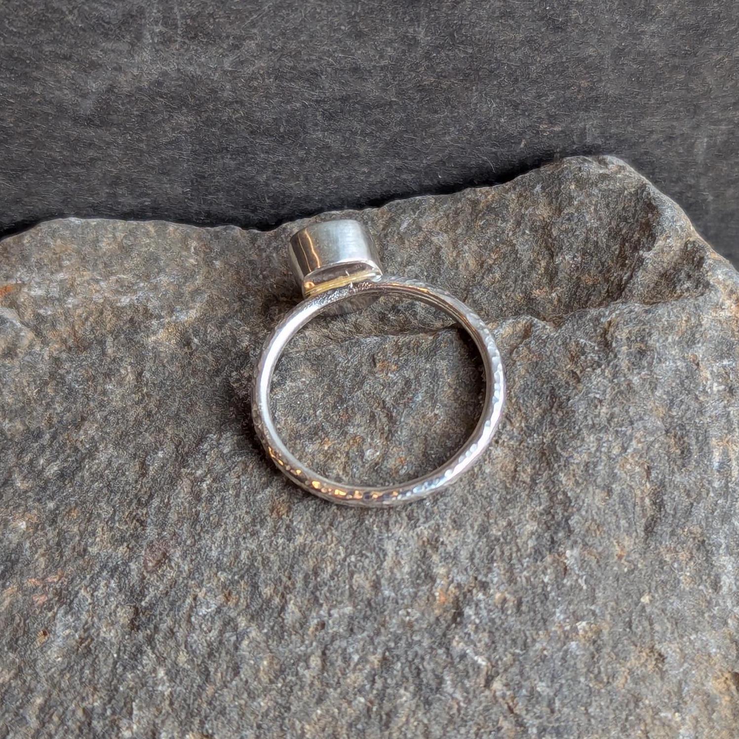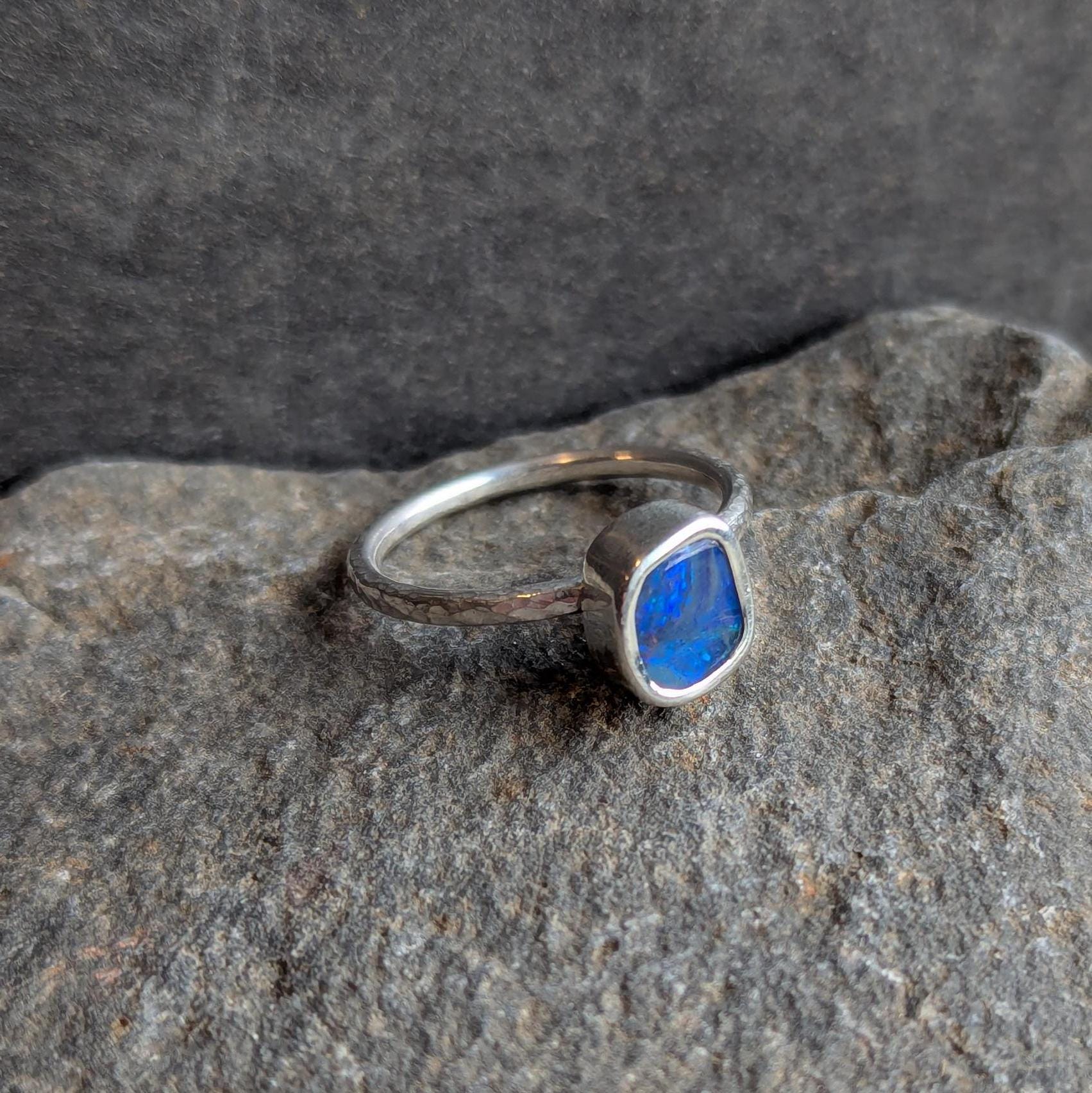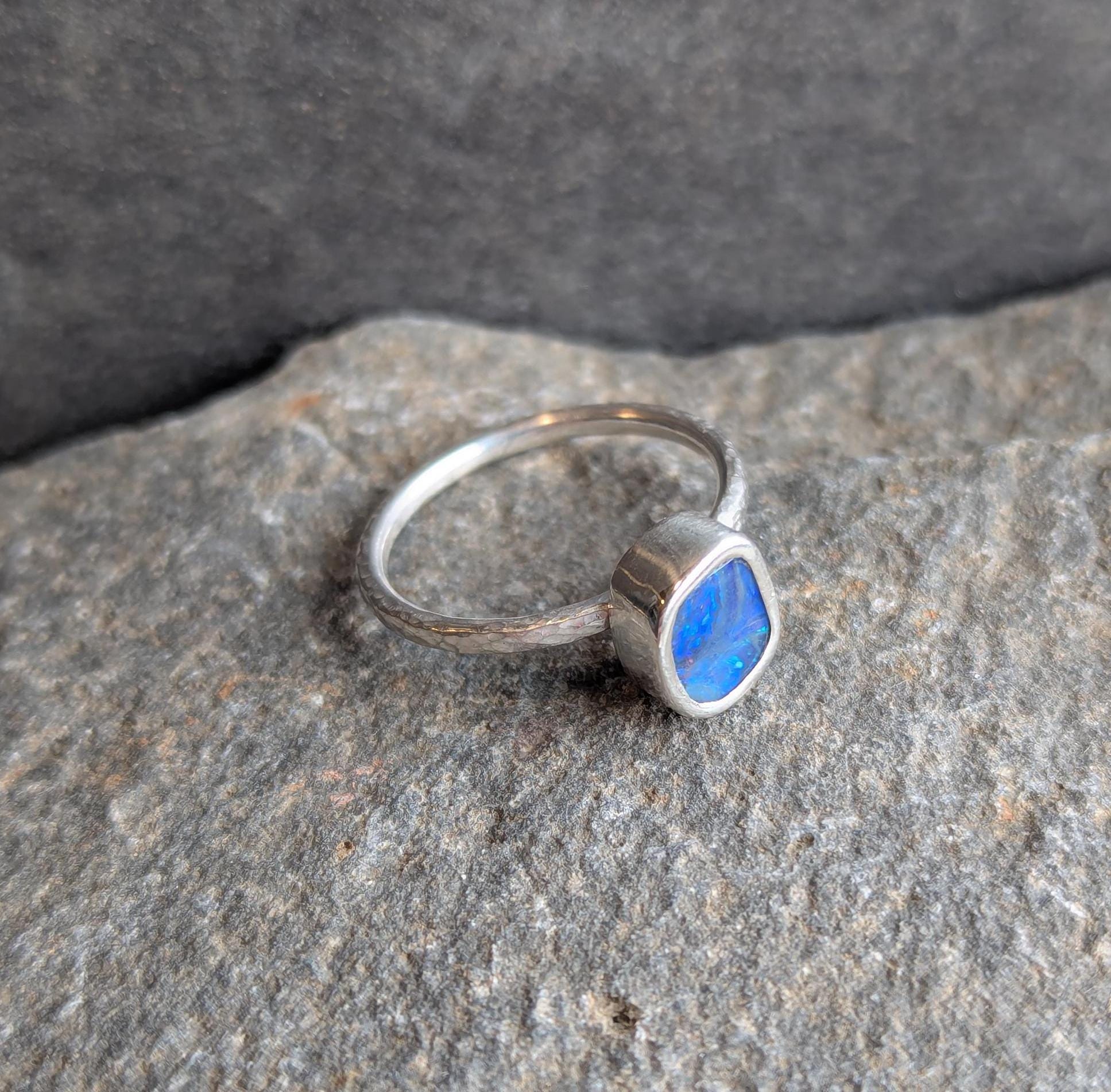 This natural solid 1.32 carat Australian Boulder Opal (not a doublet or triplet) is set in polished sterling silver. The ring band is 1.6mm with a hammered texture. It is difficult to capture all of the amazing color in this opal but it is absolutely beautiful to look at in person! This boulder opal shows some little waves of of teal and blue. Opals are the birthstone for the month of October. This ring looks great on it's own, but will also go great in a ring stack.