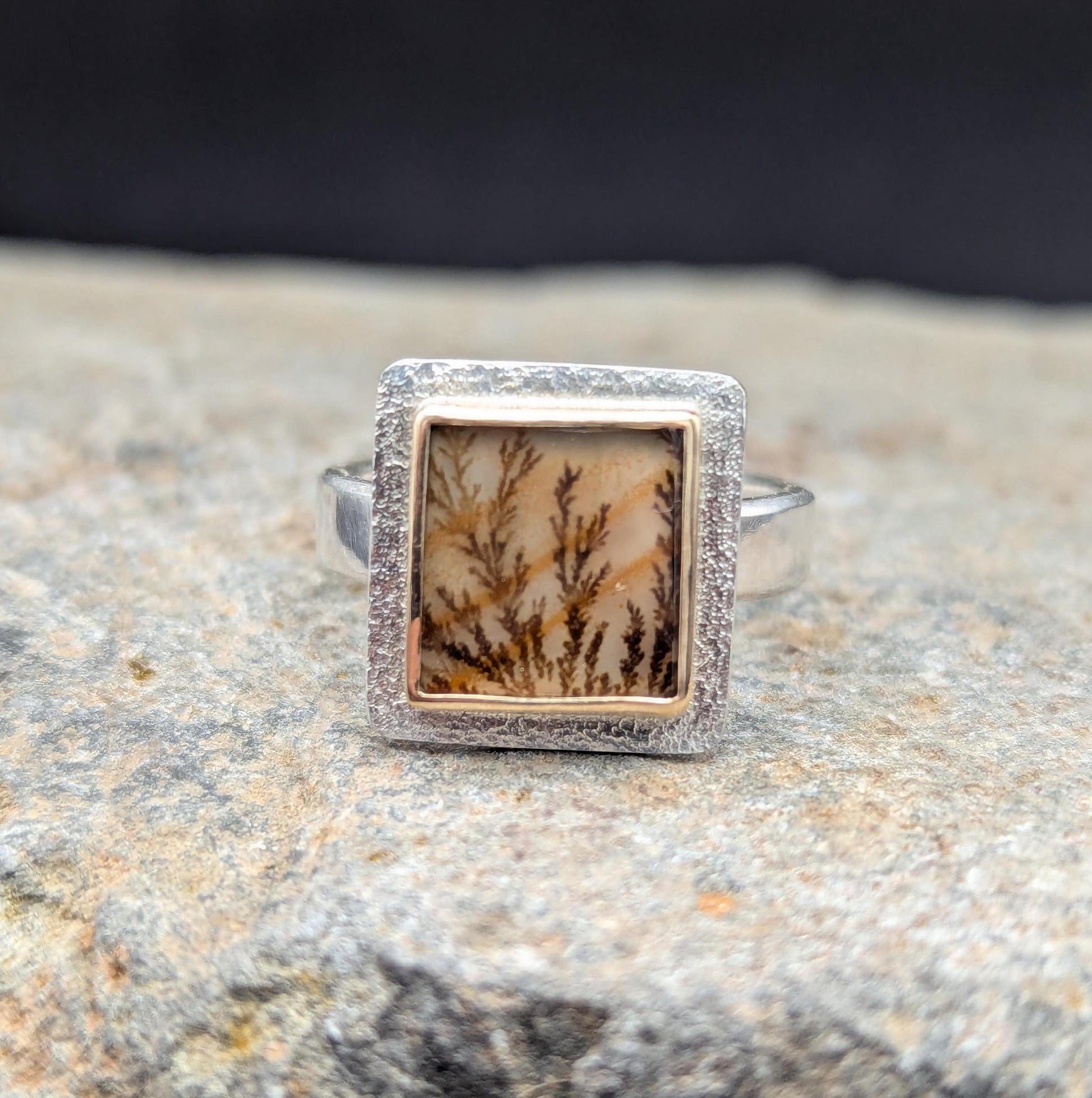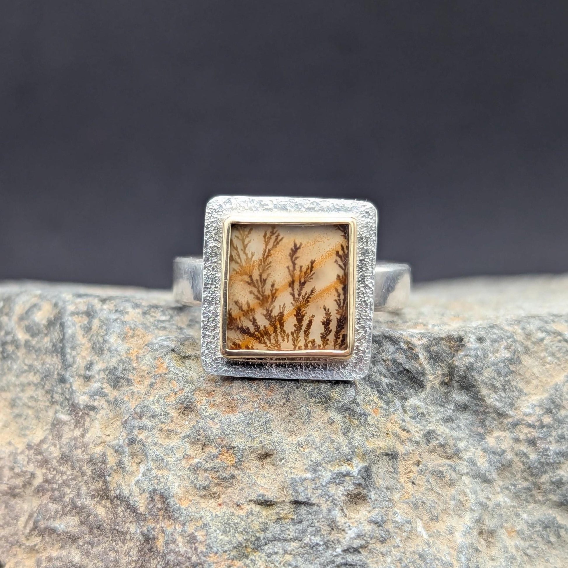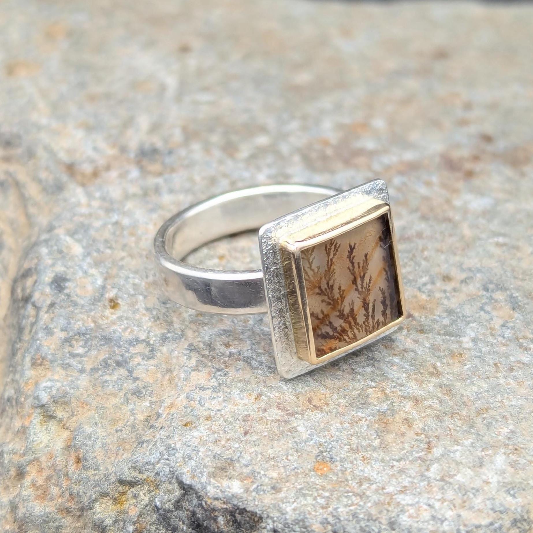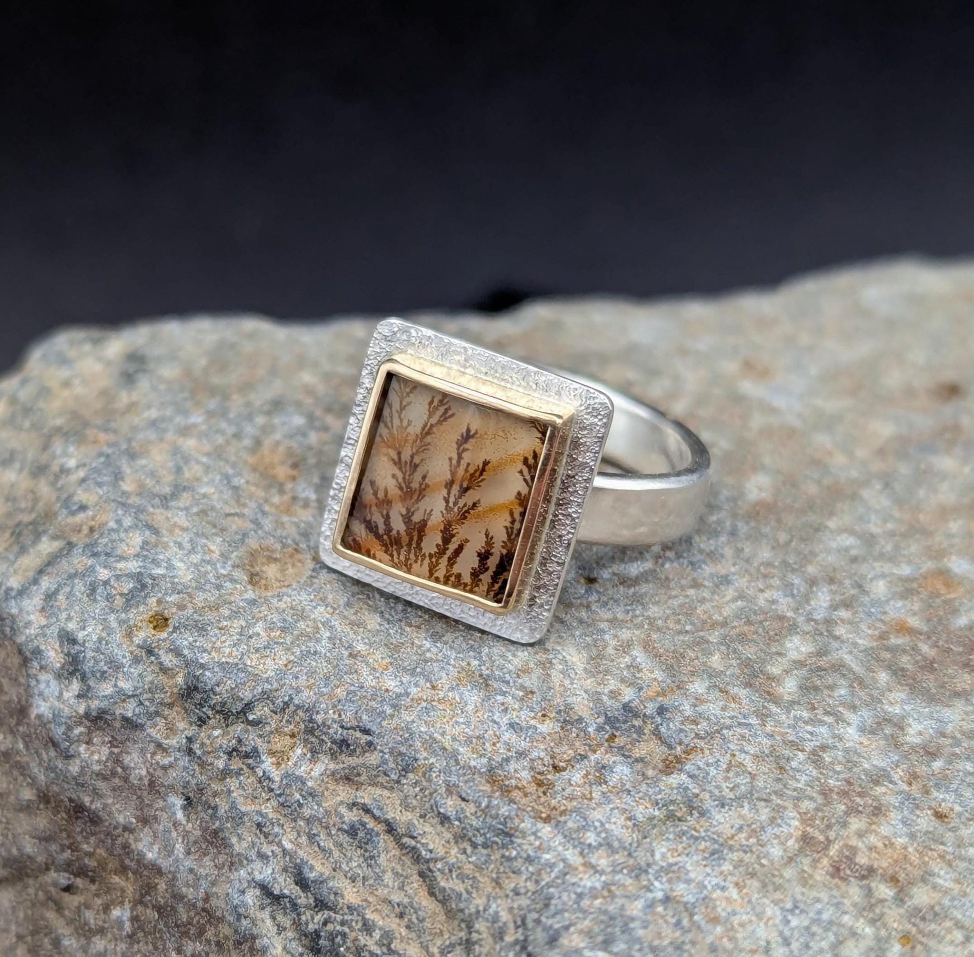 About This Ring These agates are becoming quite popular and I can see why! This stone looks like a little forest scene placed into a gold frame. The bezel is made from 18 karat gold and the ring shank and stone backing are sterling silver. This stone is paired with an closed ring shank so it will pair with some stacking rings. The band is given a brushed finish.