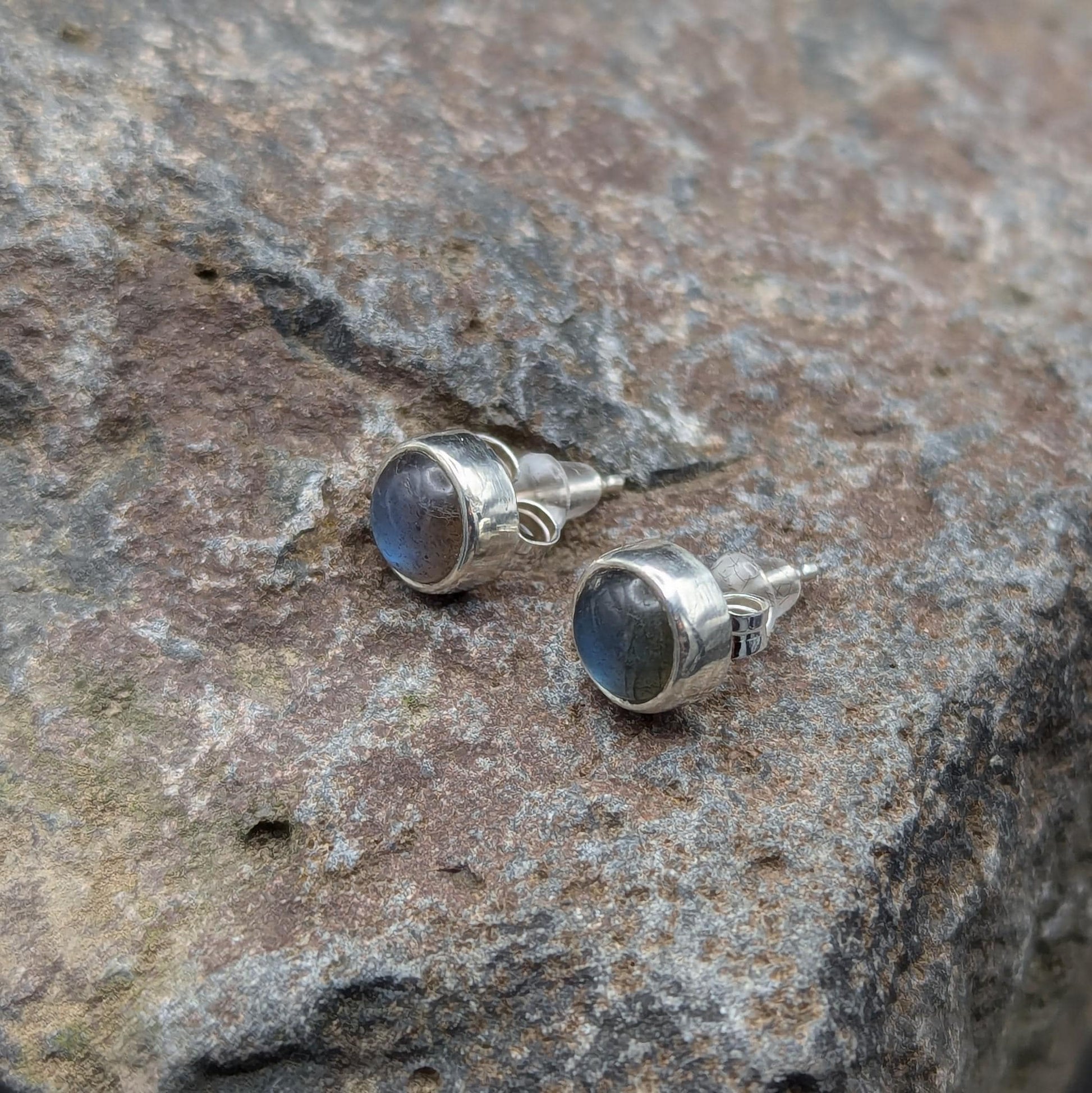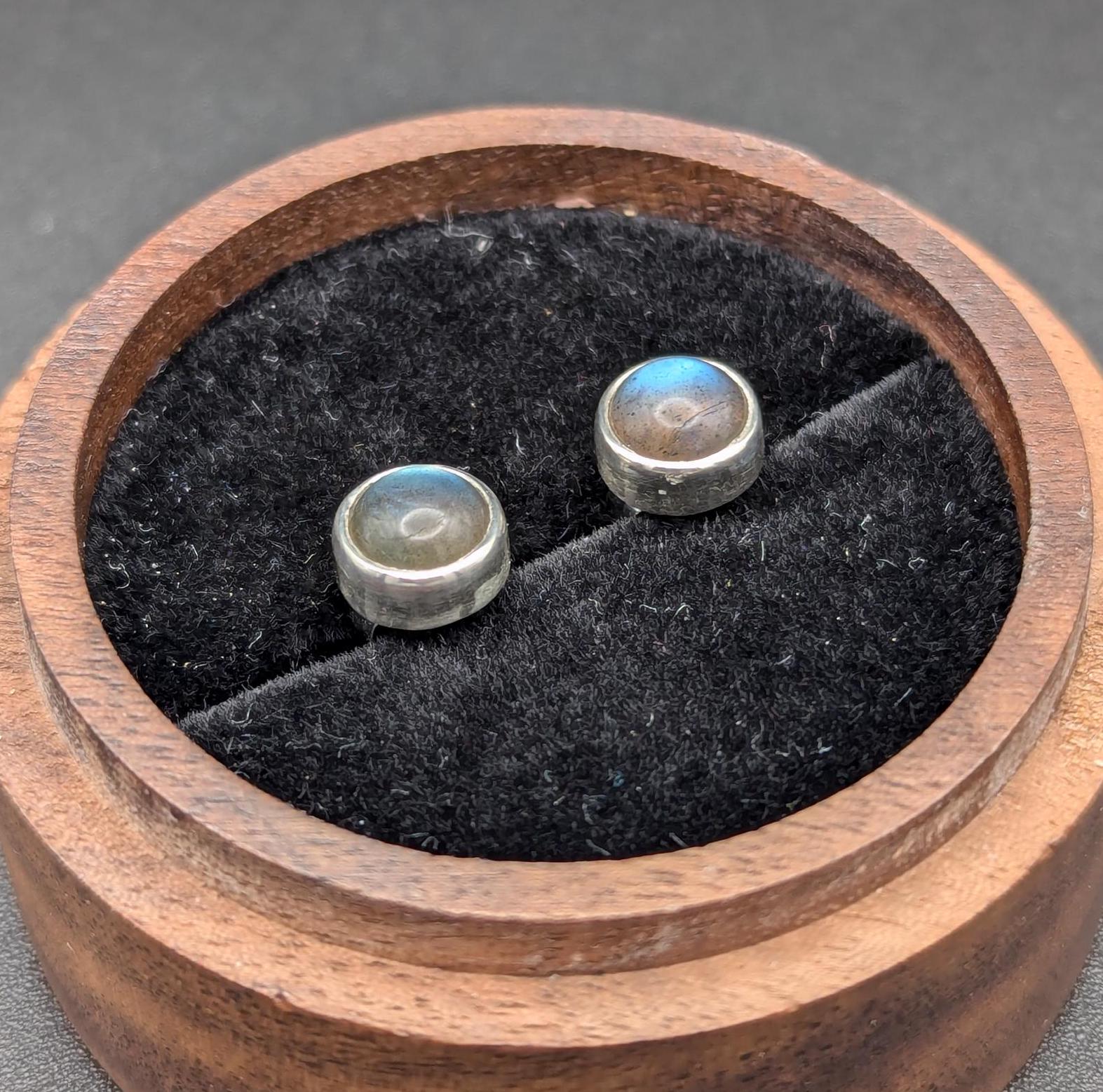 These ear studs feature a 6mm pair of natural blue sheen labradorite. These studs are carefully made from handmade sterling silver components without premade bezels. These are truly unique earrings! Includes sterling silver butterfly backings and clear silicon backings.
