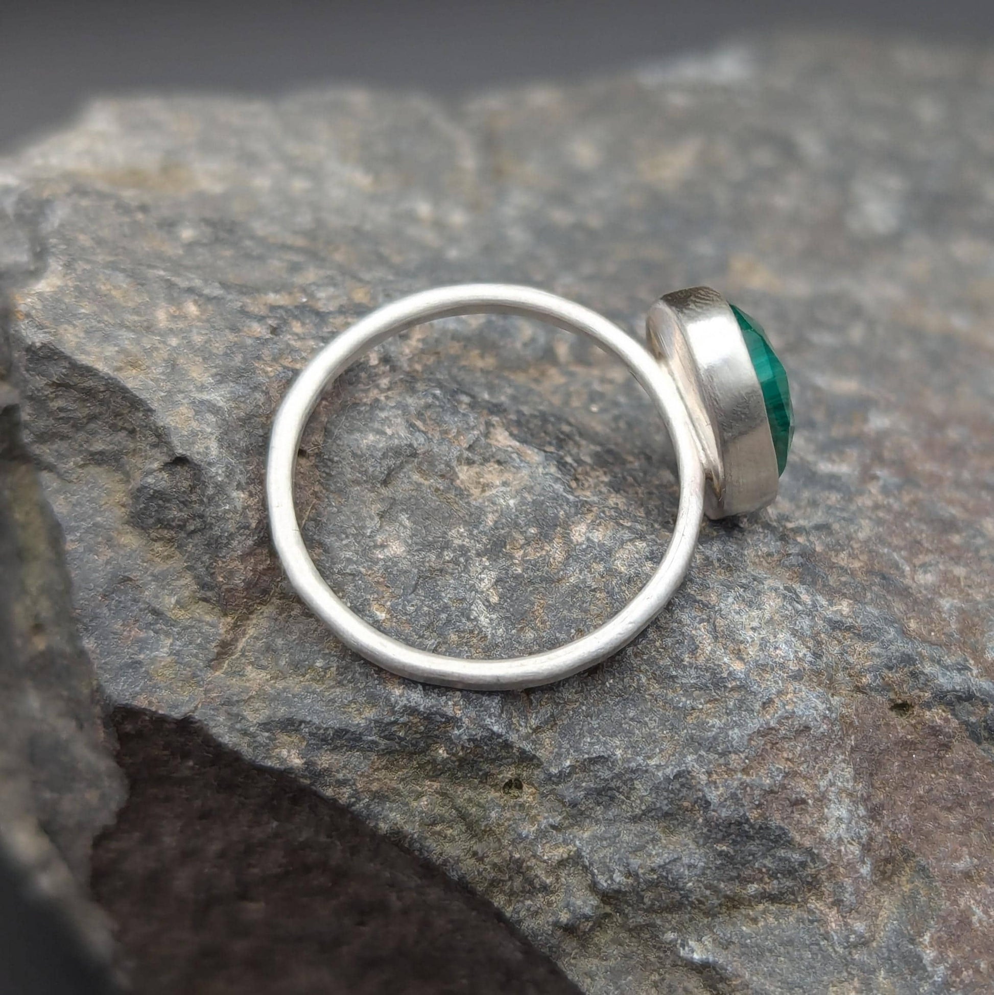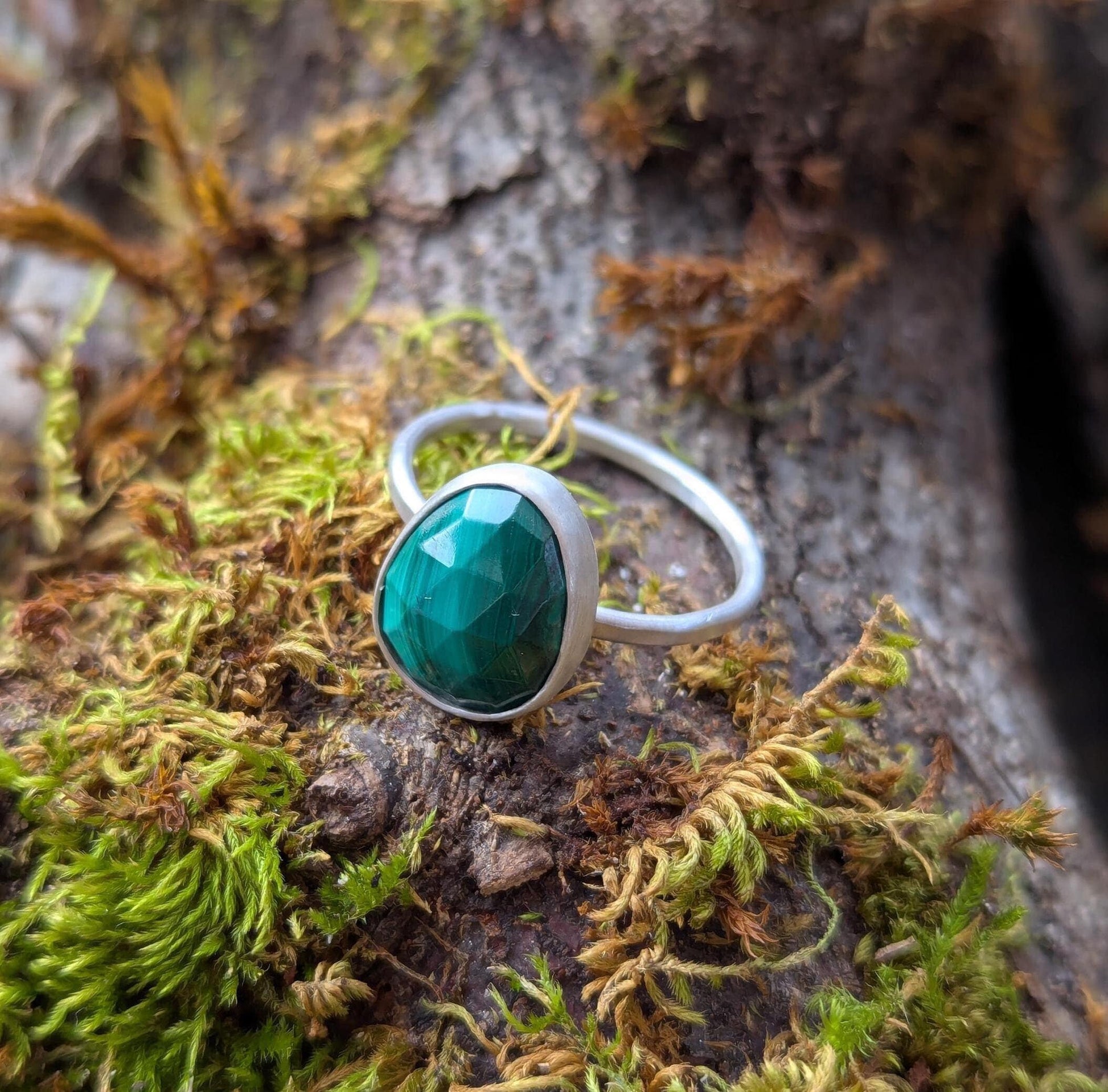 This is a lovely green Malachite rose cut ring. The sterling silver hammered band is 1.6mm wide. This ring has a brushed finish. Rings in my shop are made from 925 sterling silver sheet and wire without any prefabricated ring shanks or bezels.