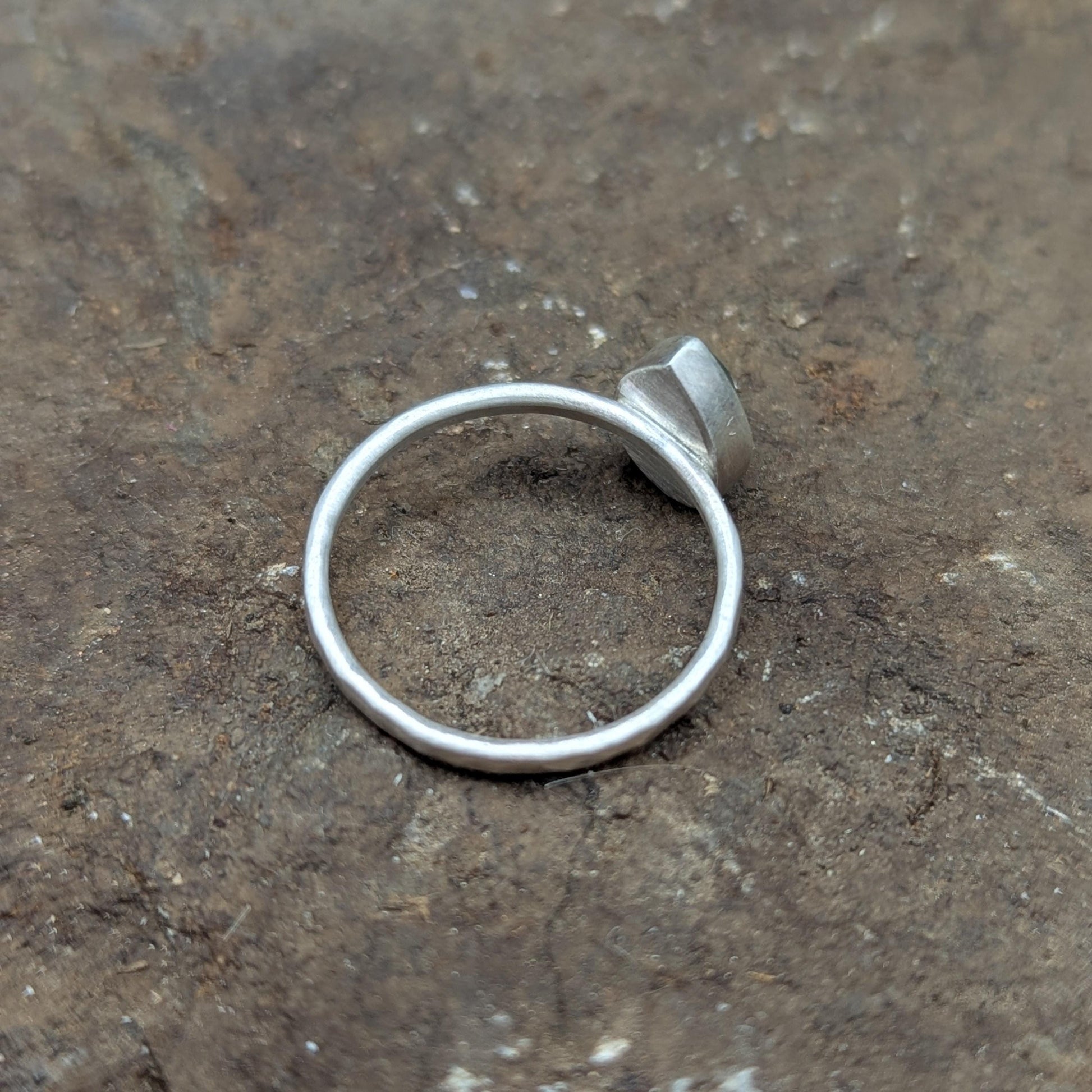 This dreamy moss aquamarine has a lovely pale blue color with mossy inclusions. The ring itself is closed and attached to the back of the bezel so this would pair well with some similar width stacking rings. Textured ring band and brushed finish.