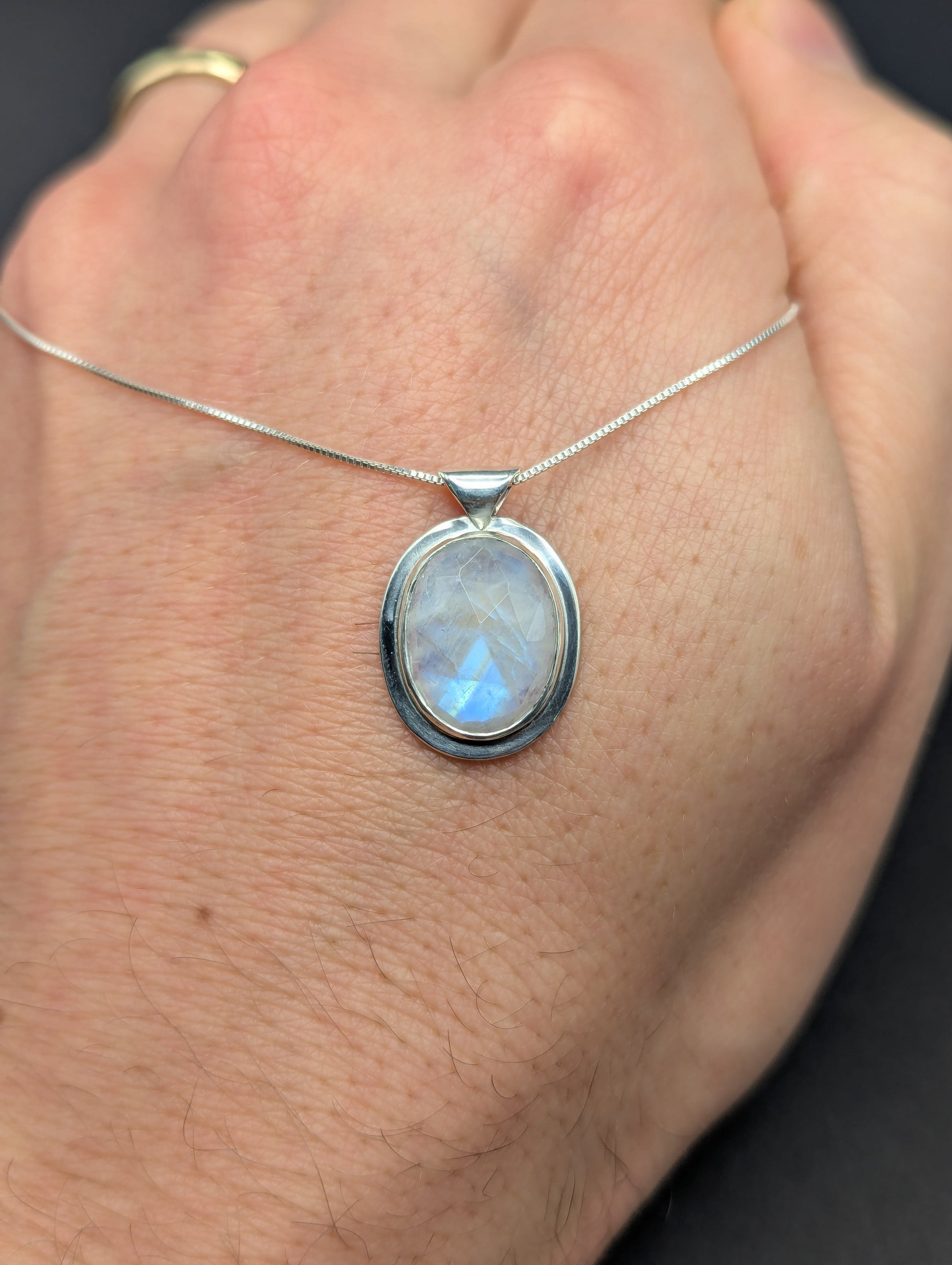 This pendant features a striking Rose Cut Rainbow Moonstone Cabochon. The rose cut is a classic style that gives the stone a gentle, faceted sparkle, allowing the subtle flash of blue and rainbow light to shine beautifully. The cabochon’s dome shape keeps the look smooth and elegant. Includes an 18" sterling silver chain.