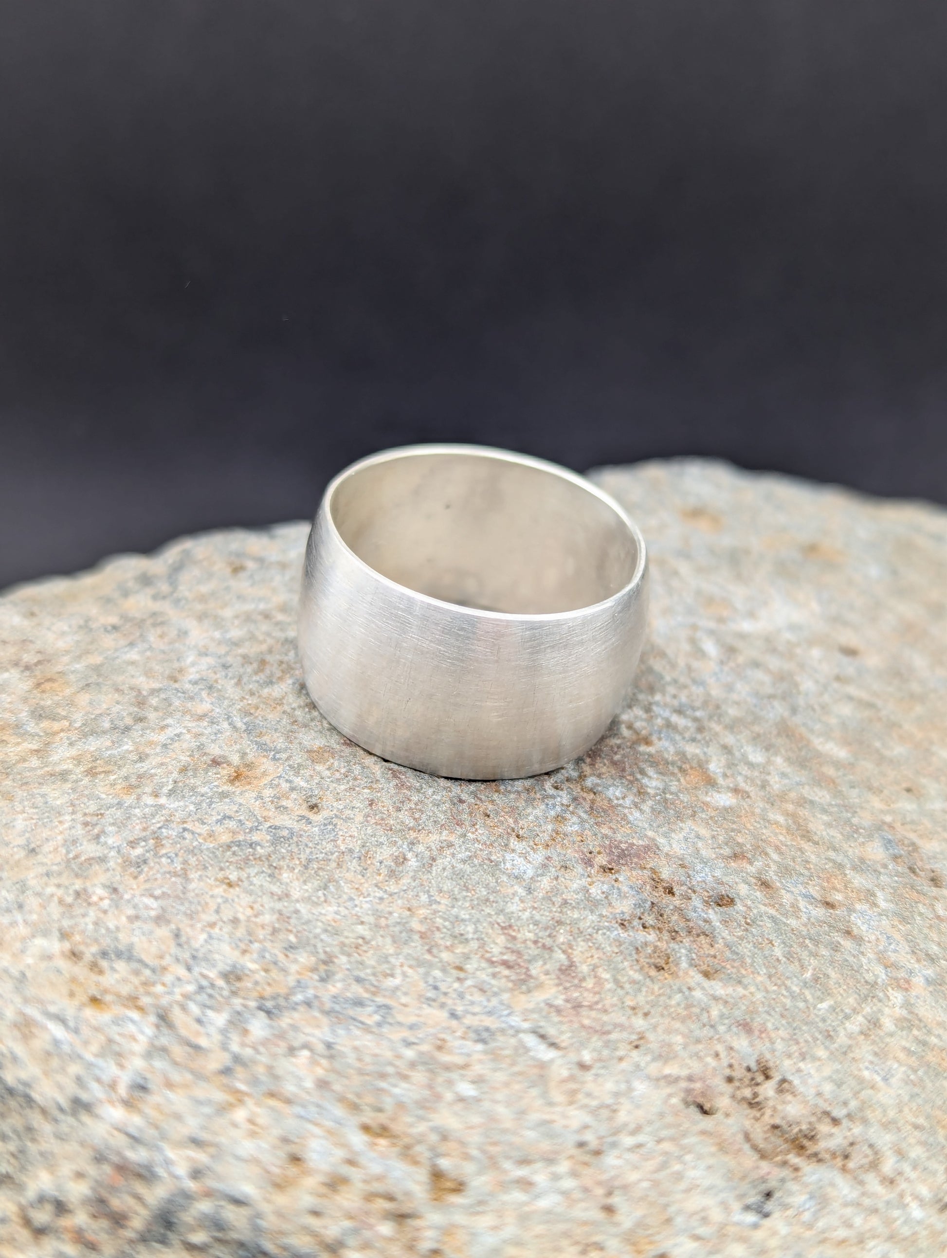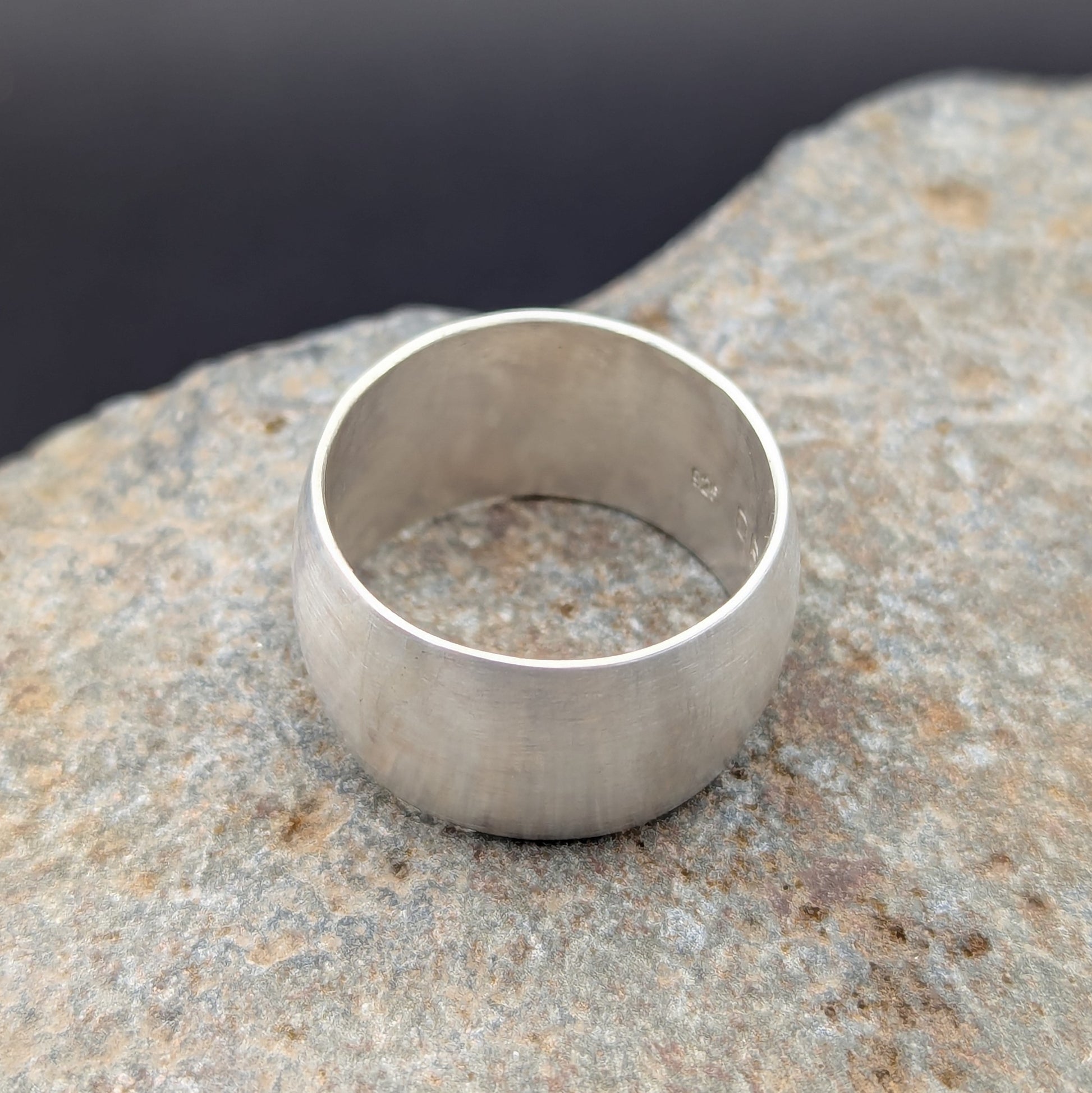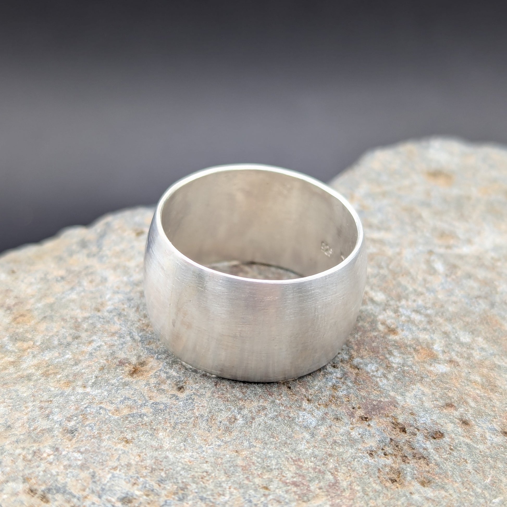 This is a handmade 12.8mm wide "cigar" band. Order this ring a half size larger than you normally wear. This ring is currently available in sterling silver with a brushed finish. It is stamped with the maker's initials (DF) and "925" to denote sterling silver.