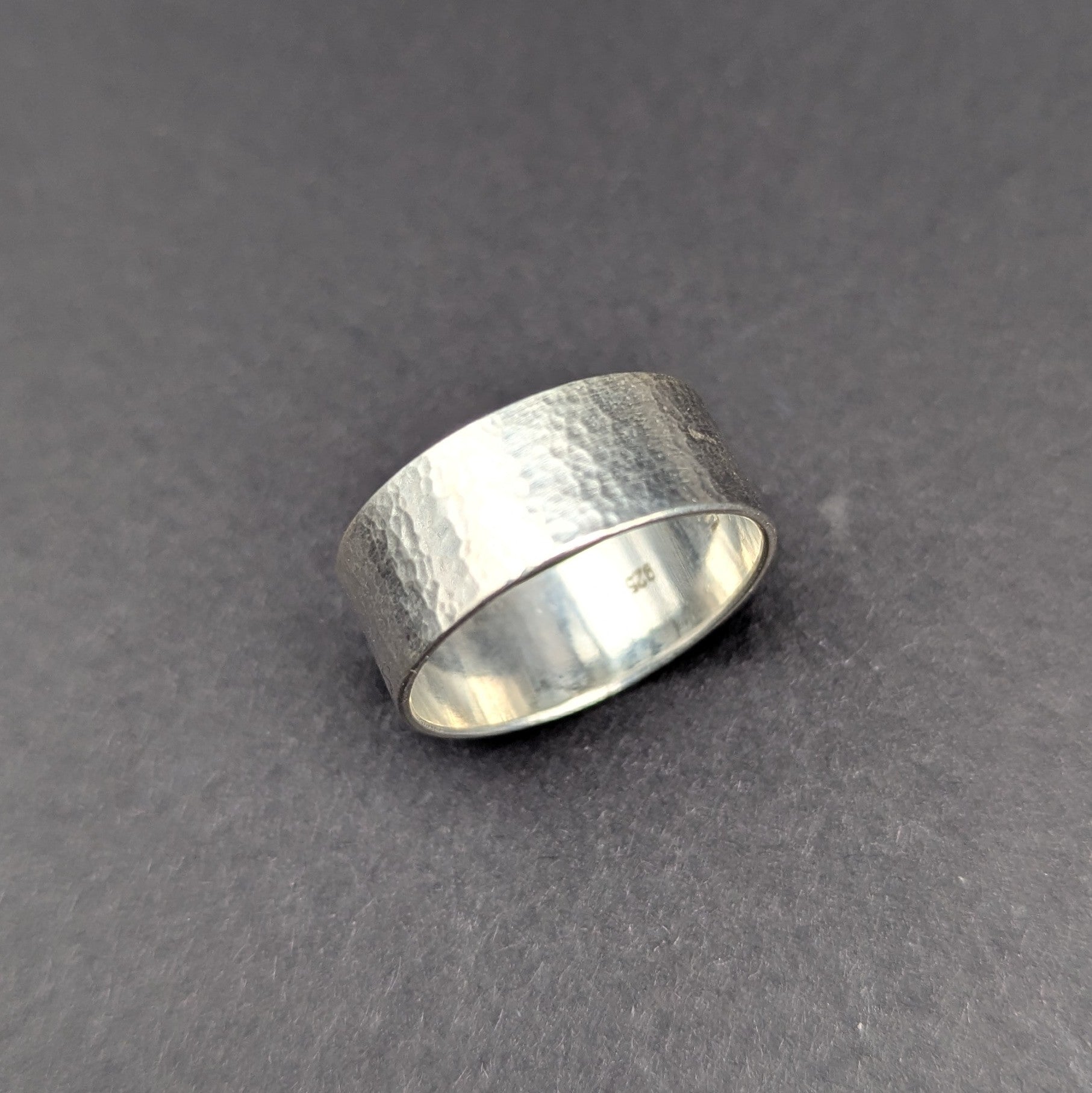 Hand formed and textured sterling silver band. This ring ends up close to 9mm wide and 1mm thick. Please note brushed or polished finish.